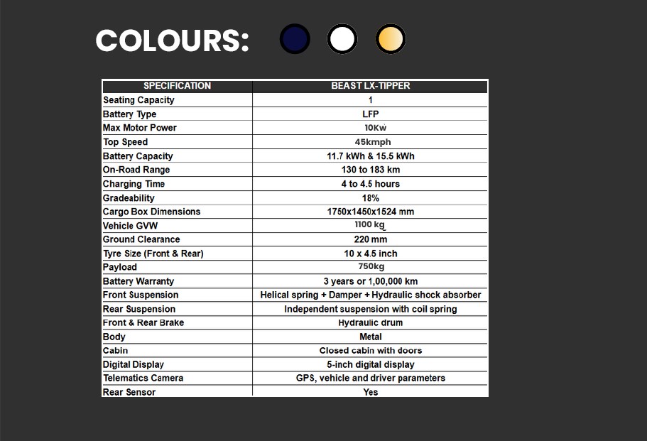 Equipped with an advanced LFP battery backed by a 3-year warranty, BEAST LX-AUTO TIPPER DD offers reliable performance and minimal downtime.